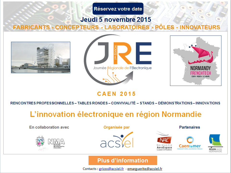 ACSIEL – Journée Régionale de l’Electronique (JRE) – Jeudi 5 Novembre 2015 à Caen Pour en savoir plus : ACSIEL / JRE Partager Facebook Twitter Whatsapp Linkedin Email Poster le commentaireVotre adresse e-mail ne sera pas publiée. Les champs obligatoires sont indiqués avec *Commentaire * Nom E-mail Site web