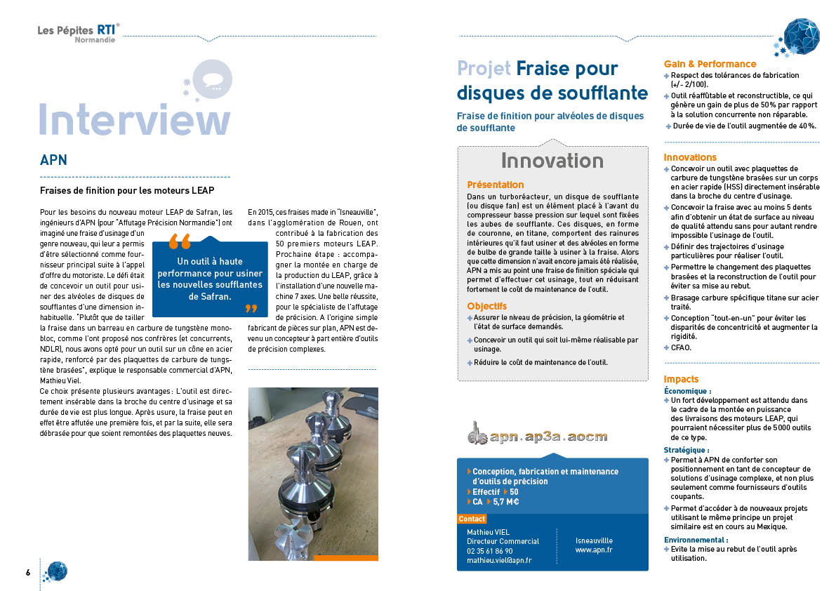 APN, Pépites RTI de Normandie AeroEspace présente sa fraise pour disques de soufflante :Développement d’une fraise de finition pour alvéoles de disques de soufflante.…
