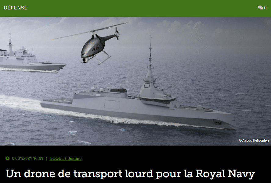 Une demande d’information a été publiée pour la Royal Navy visant à étudier le marché des drones de transport lourd pouvant être déployés dans un environnement salin. Les réponses de cette étude viendront renforcer les connaissances de la Royal Navy et pourraient potentiellement donner lieu à une décision d’acquisition ultérieurement.